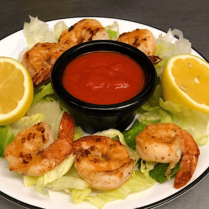6 pieces. Jumbo shrimp grilled to perfection over a bed of lettuce, served with tomato sauce.