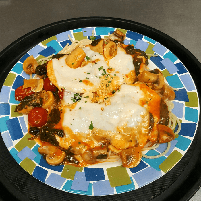 Tender chicken breast sauteed in Marsala wine, garlic, and mushrooms over pasta.
