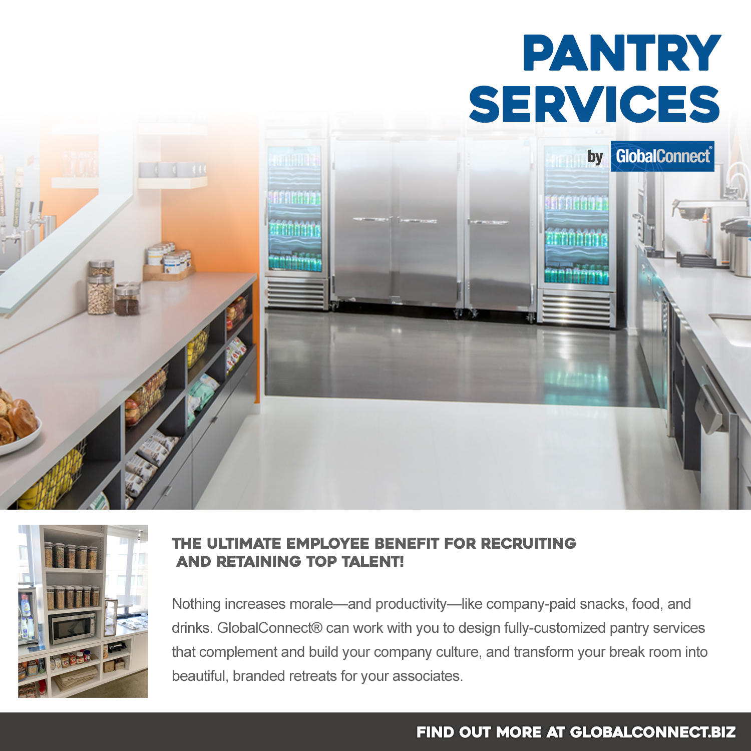 Nothing increases morale—and productivity—like company-paid snacks, food, and drinks. GlobalConnect® can work with you to design fully-customized pantry services that complement and build your company culture, and transform your break room into beautiful, branded retreats for your associates.