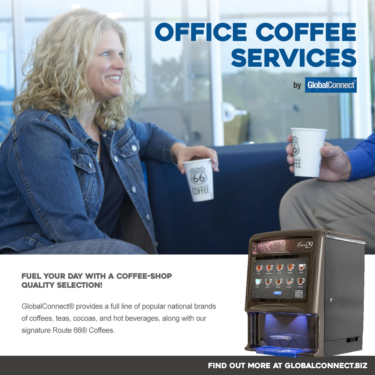 Fuel your day with a coffee-shop quality selection! GlobalConnect® provides a full line of popular national brands of coffees, teas, cocoas, and hot beverages, along with our signature Route 66® Coffees. Whether you simply need brewed coffee for a small office, bean-to-cup fresh ground on-demand options, or your own craft coffee cafe, we've got you covered!