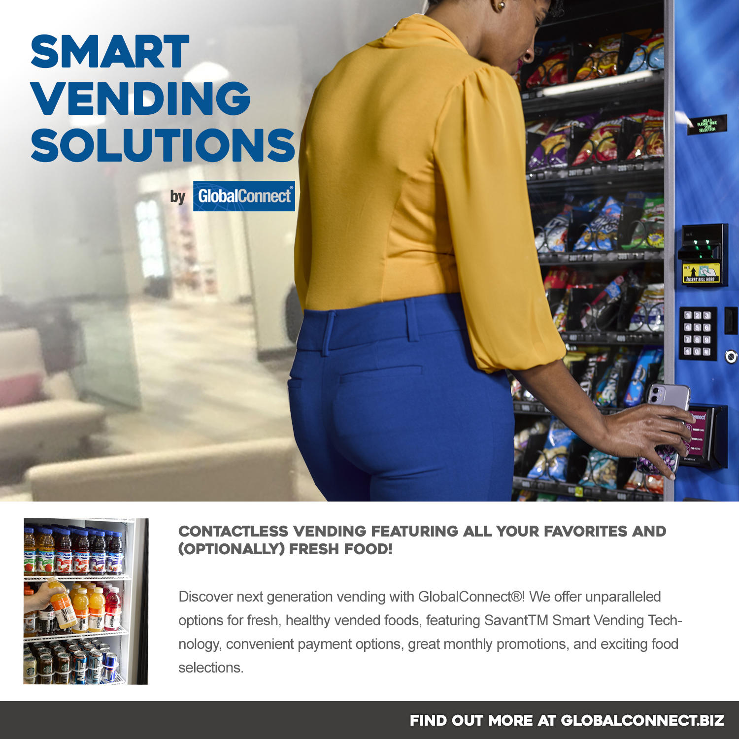 Discover next generation vending with GlobalConnect®! We offer unparalleled options for fresh, healthy vended foods, leading national brands, fresh foods and local favorites. Fully customizable, and featuring SavantTM Smart Vending Technology, your team will enjoy convenient payment options (including cashless, contactless options), great monthly promotions, and exciting food selections.