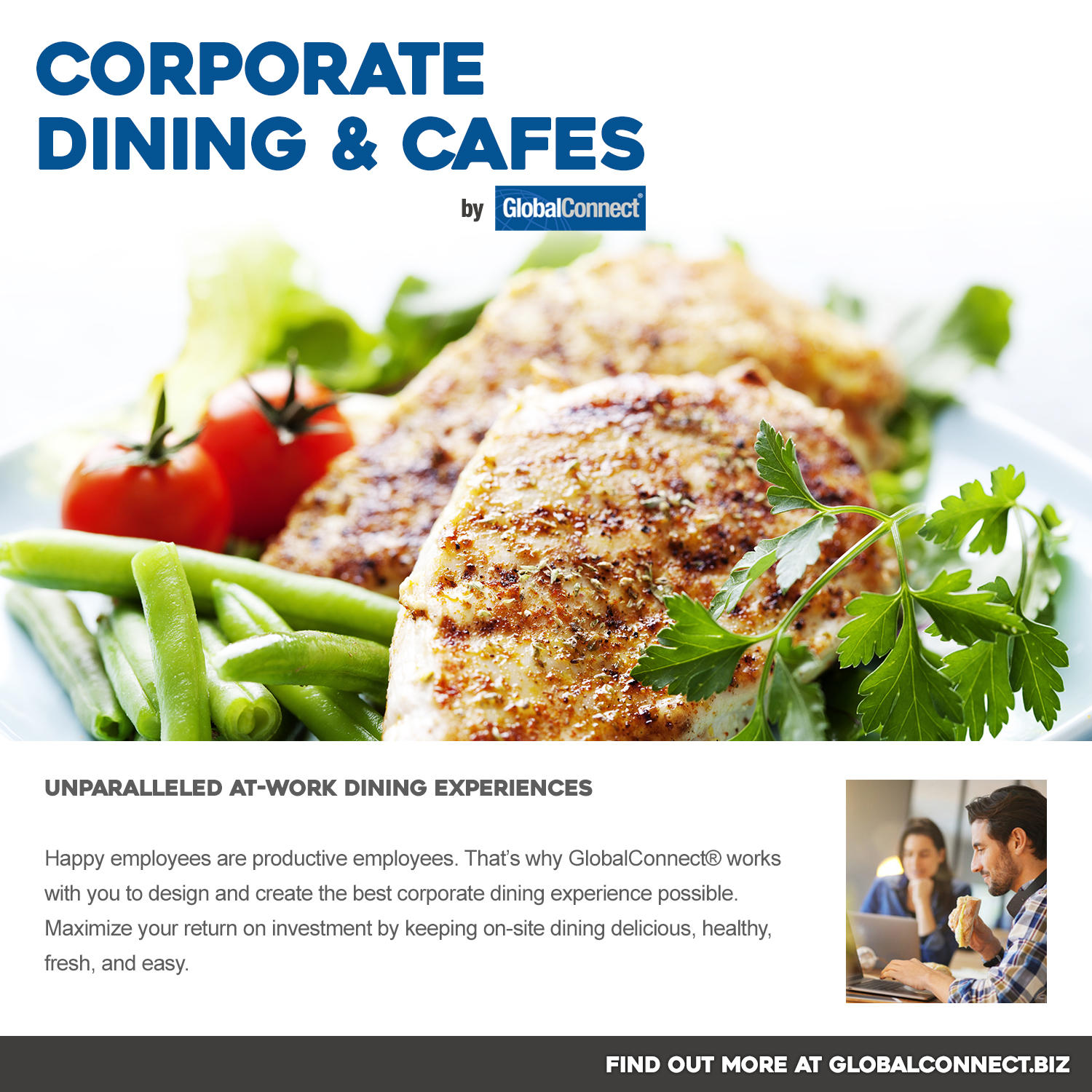 Happy employees are productive employees. That’s why GlobalConnect® works with you to design and create the best corporate dining experience possible. Maximize your return on investment by keeping on-site dining delicious, healthy, fresh, and easy.